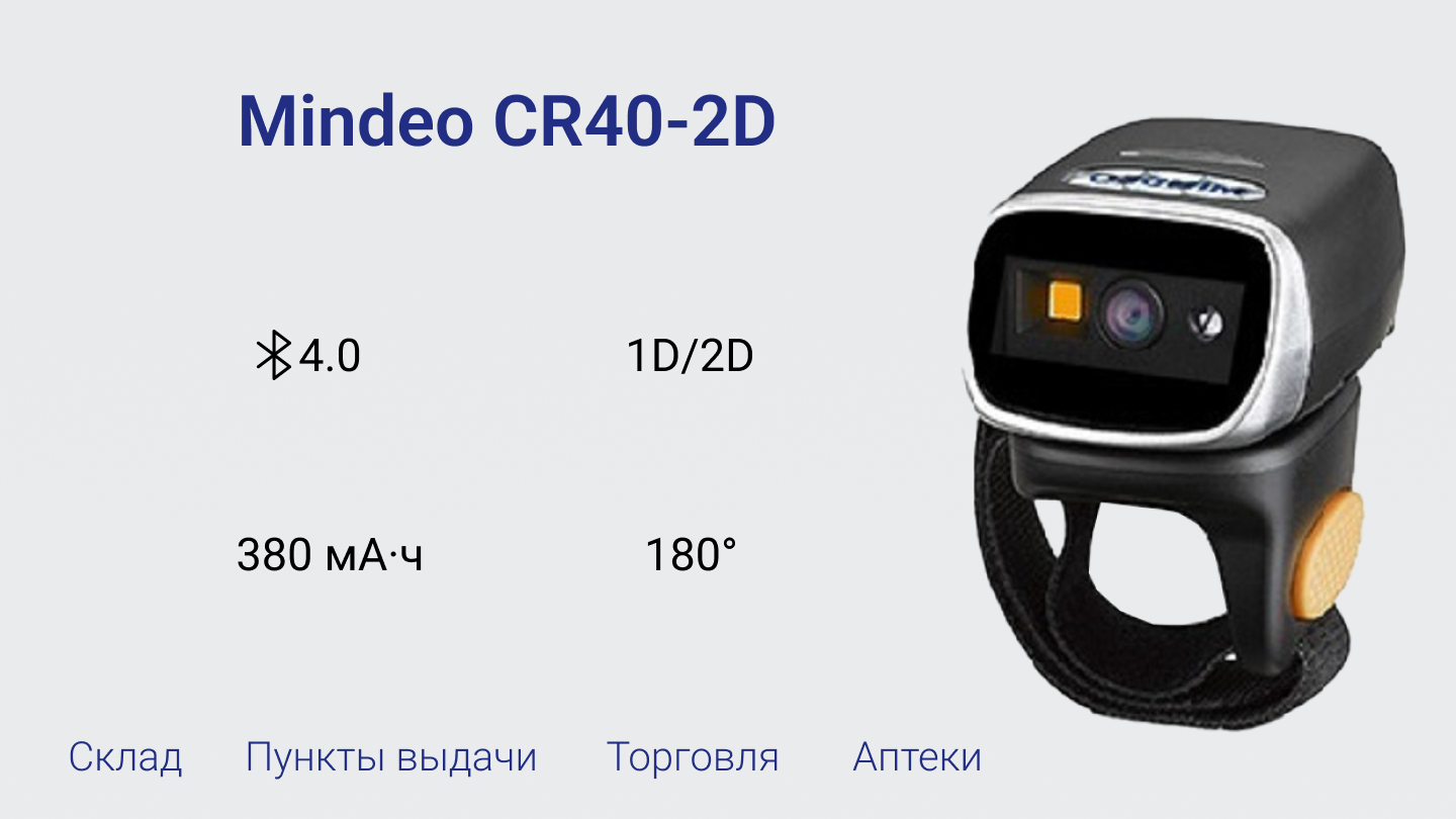 Mindeo CR40-2D — сканер-кольцо, сочетающий в себе компактность, стабильность и высокую производительность по доступной цене. Что умеет CR40-2D?Считывает как 1D, так и 2D коды — включая QR, PDF417 и DataMatrix. Он одинаково хорошо справляется с печатными этикетками и экранами мобильных устройств, что делает его универсальным решением для современной розницы, точек выдачи заказов, аптек и биллинговых систем. Благодаря совместимости с устройствами на iOS, Android и Windows (смартфоны, планшеты, ноутбуки), сканер легко интегрируется с мобильными решениями и превращает любое устройство в полноценный терминал сбора данных. Ключевые преимущества: